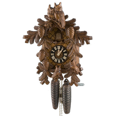 Model #8710-4 Hones 8 Day Owls German Cuckoo Clock from the Black Forest, very detailed carvings with night shutoff. 15.5″ Tall Cuckoos the number of hours on the hour. Cuckoos once on the 1/2 hour Hand carved case. Brass German made clock movement. Wood dial Wood Cuckoo Bird .Night Shutoff