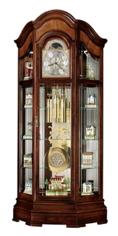 •  A total of six glass shelves are offered for presenting your collectibles, three adjustable shelves run across the entire width of the cabinet, 5-1/2″ behind the moving pendulum. Cabinet is illuminated by an interior light.