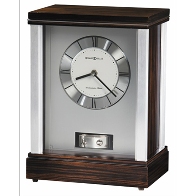 This mantel clock features brushed aluminum corners and polished silver-tone accents which complement the faux Macassar Ebony finished top and base.