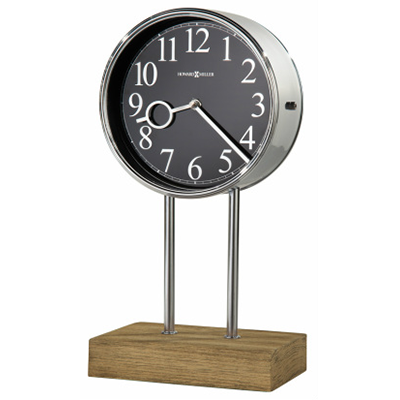 This mantel clock features a wide polished chrome bezel which is 7.25″ in diameter, chrome posts and chrome metal bottom base, and a Driftwood finished veneer wood base.