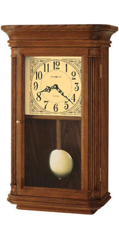 This Westbrook Wall Clock features an Oak Yorkshire finish on select hardwoods and veneers to complement your home decor. The decorative model includes rounded corners on a fully molded base, flared molded bonnet, and a brass-finished bob on a wooden pendulum.